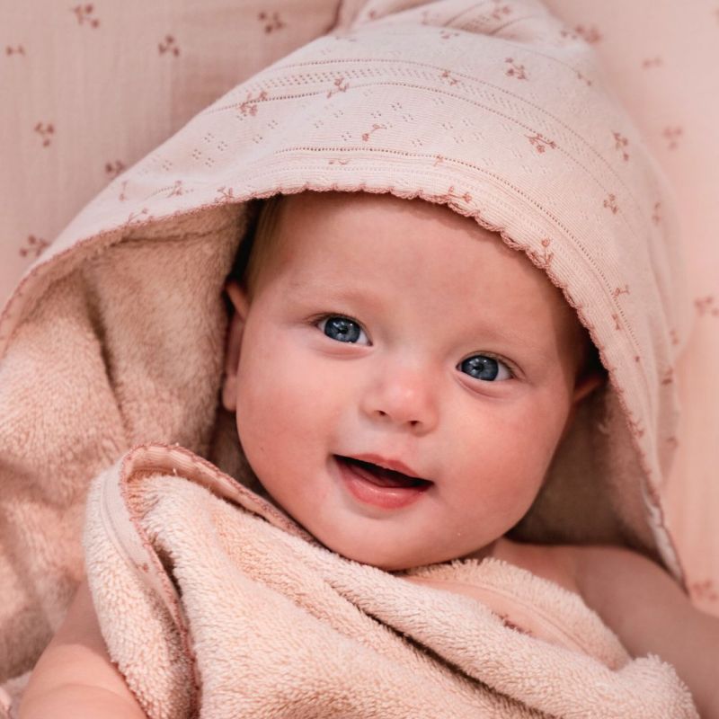 Avvolgi il tuo piccolo in calore e morbidezza con questo asciugamano con cappuccio. Realizzato in spugna di cotone biologico al 100%, è morbido e delicato sulla pelle delicata del tuo bambino. Progettato sia per praticità che per fascino, il morbido cappuccio avvolge il tuo piccolo, assicurandogli calore e intimità dopo ogni bagno. L'asciugamano ha un delizioso colore rosa Blossom e il cappuccio è decorato con adorabili fiori ricamati della collezione Fairy Garden.