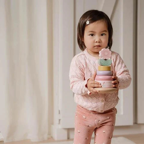 Accetta la sfida di impilare gli anelli sulla base girevole! È un gioco divertente che richiede la massima attenzione. Impila gli anelli nell'ordine corretto e posiziona il fiore in cima alla torre. Questa splendida torre girevole in legno della collezione Fairy Garden è progettata per sviluppare la coordinazione occhio-mano dei bambini in modo giocoso.