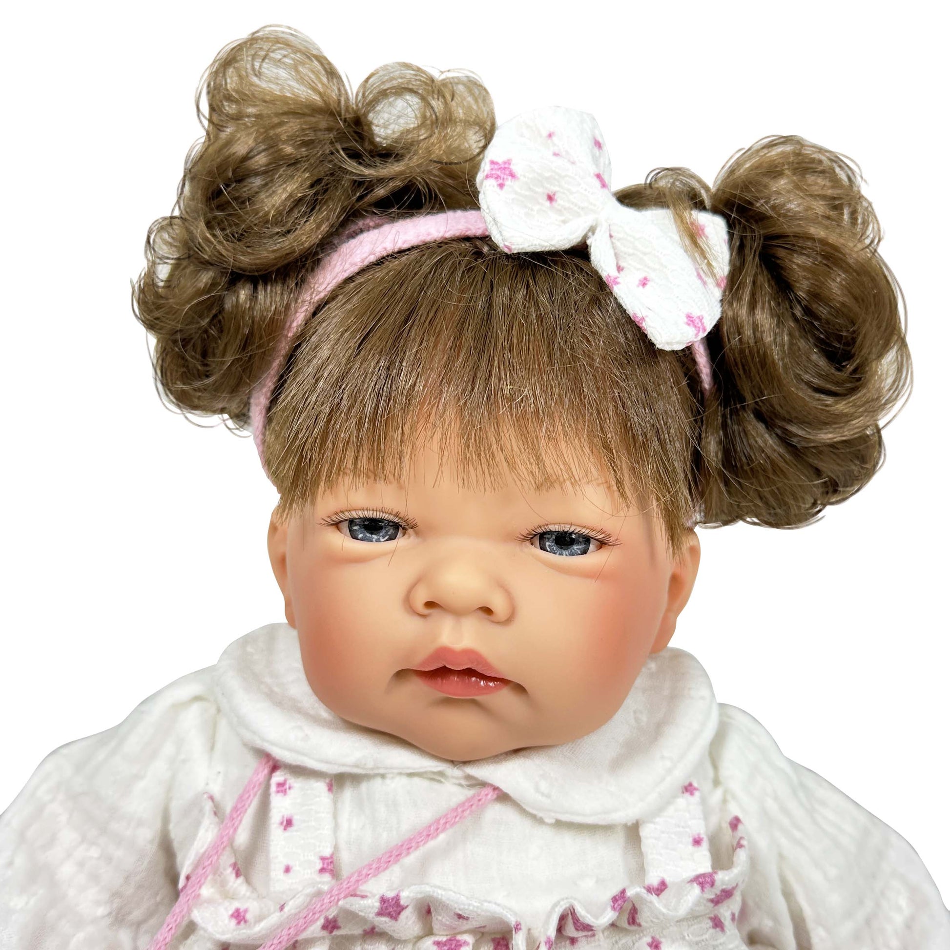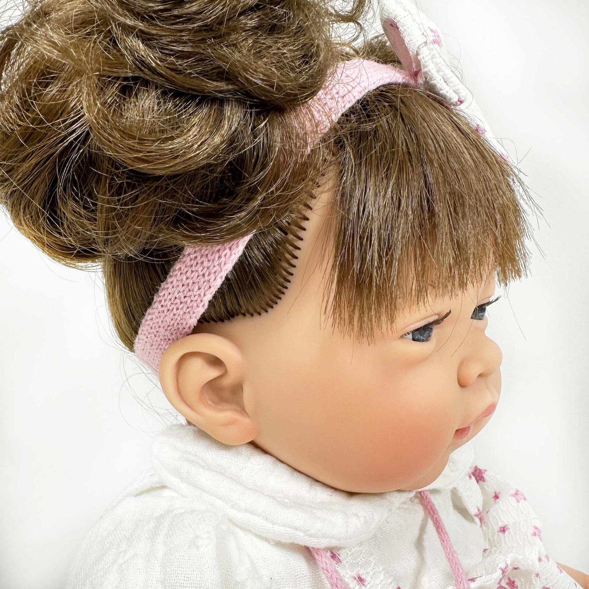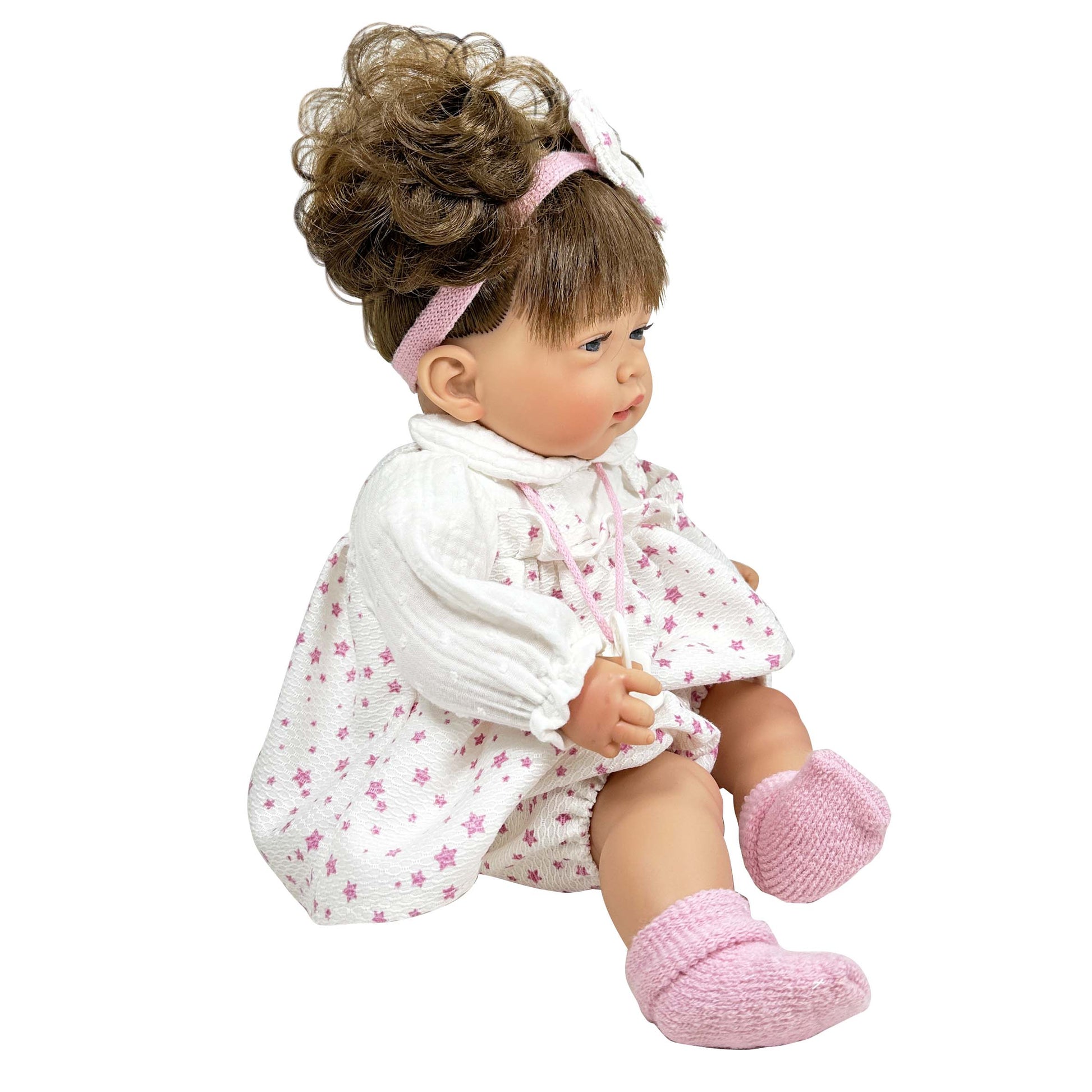 CELIA è una bambola che misura 45 cm. Ha arti in vinile e un corpo morbido in tessuto ipoallergenico, accompagnata da tessuti moderni come la mussola per i suoi vestiti e le cuciture per i suoi stivaletti, con una bellissima fascia abbinata.