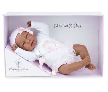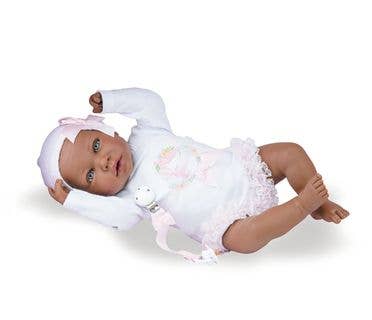 È completamente realizzata in Spagna con materiali di alta qualità. Indossa un bellissimo body con volant in pizzo e un cappellino abbinato. Il corpo è morbido e la testa e gli arti sono in plastica vinilica molto morbida.