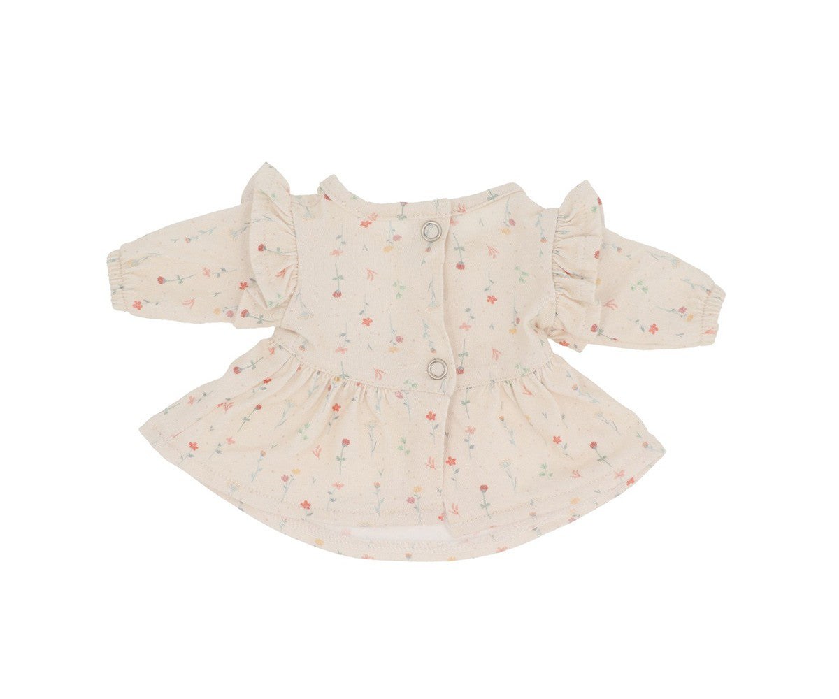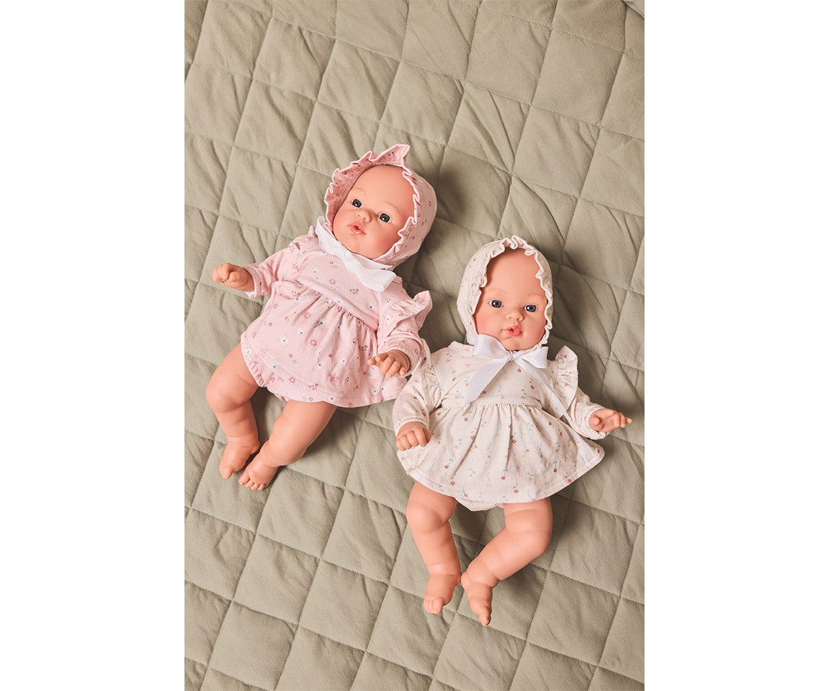 Questa bambola è vestita con gli abitini dell'esclusiva collezione Monnëka: un vestito, una braghetta e una fascia per i capelli.