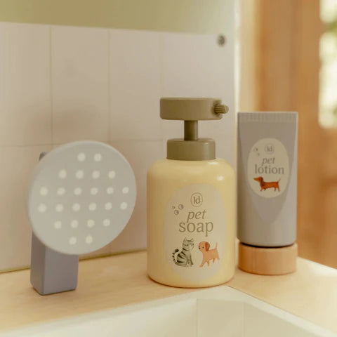 Ti prendi cura di animali di peluche malati? Con questo ampio ambulatorio veterinario in legno, il tuo piccolo potrà immergersi completamente nei panni di un vero veterinario. Il set include tutto il necessario per prendersi cura degli animali domestici, come una doccia retrattile con lavandino, un pettine, un termometro, una siringa e cerotti. Sono inclusi anche una fascia in tessuto e una clip speciale per appendere illustrazioni mediche e radiografie. È ora del prossimo paziente!
