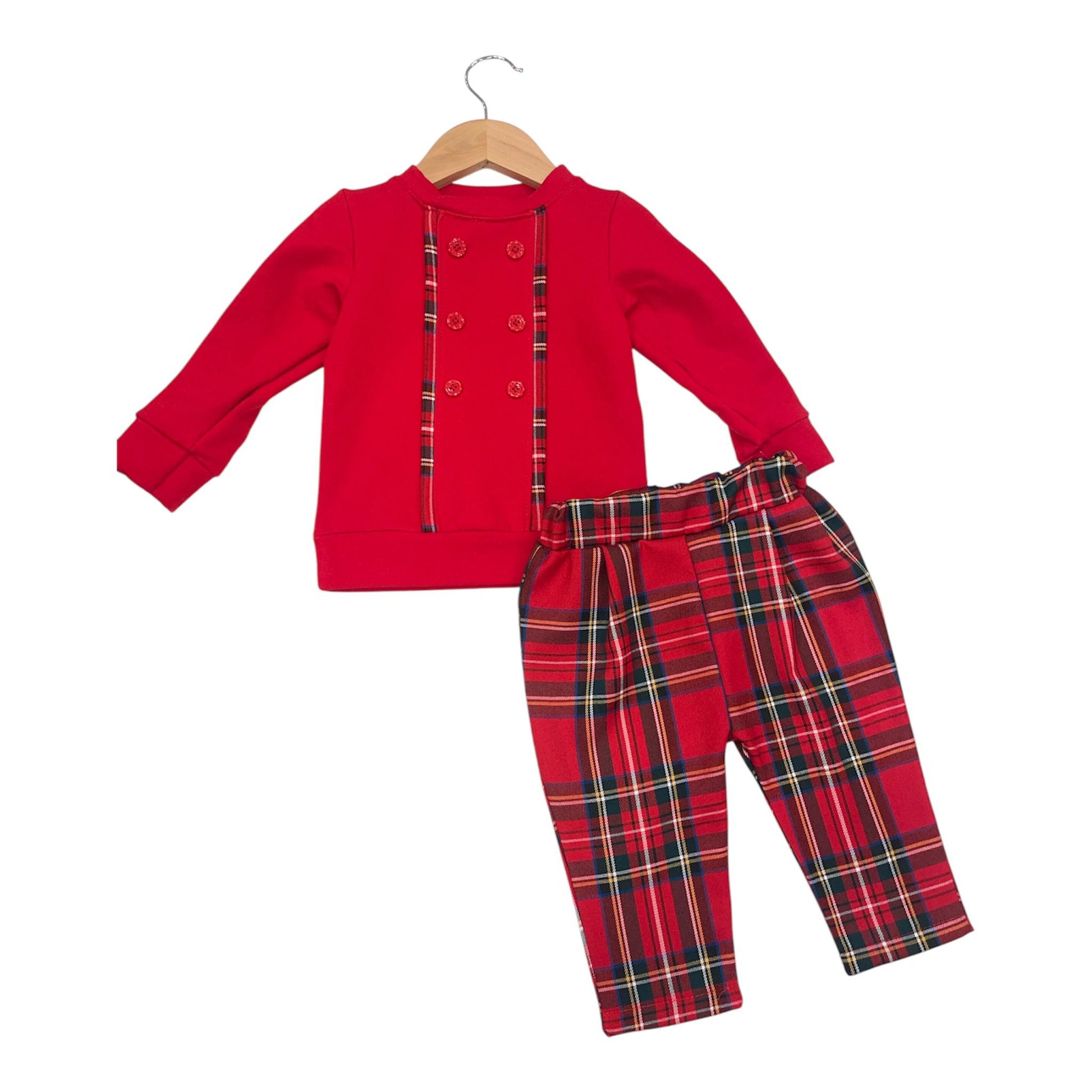 Completo composto da felpa con bottoni e dettagli in tartan e pantalone in tartan con elastico in vita
