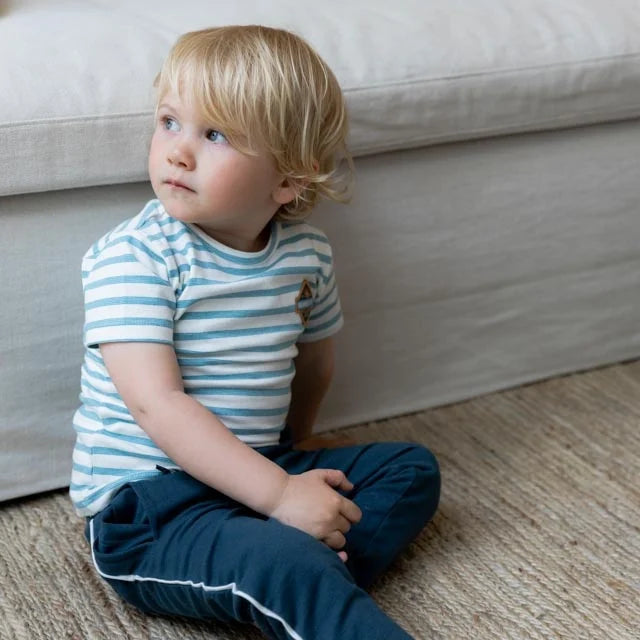T-shirt in cotone elasticizzato a righe azzurre e bianche che le donano un look molto estivo.